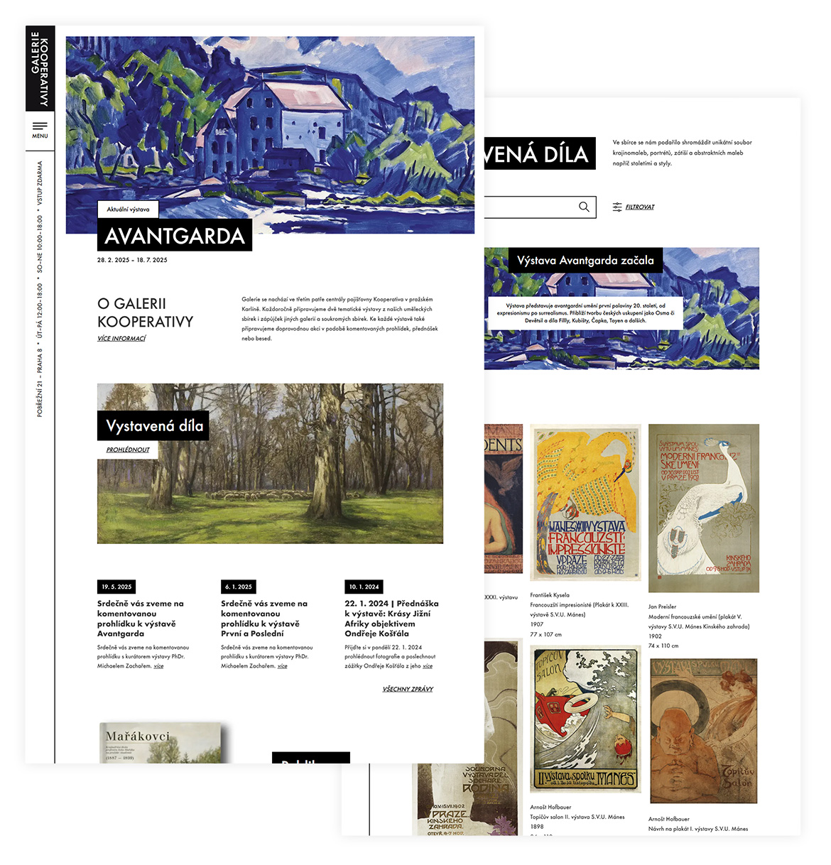 Zařídili jsme také redesign sekce Galerie Kooperativy. Jde o online prezentaci skutečné galerie Kooperativy, kde se aktuálně nachází cenný soubor více než 3 000 obrazů, kreseb, grafik a dalšího umění. Na webu lze aktuálně vystavená umělecká díla jednoduše vyhledávat a filtrovat podle jména autora nebo námětu. Na stránkách také najdete informace o probíhajících či plánovaných výstavách nebo publikační činnosti Galerie.